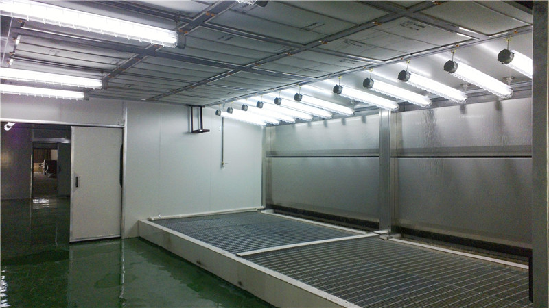 噴漆時,外部空氣經(jīng)過初級過濾網(wǎng)后由風機送到房頂,再經(jīng)過頂部過濾網(wǎng)二次過濾凈化后進入房內(nèi),房內(nèi)空氣采用全降式,以0 2-0 3m s的速度向下